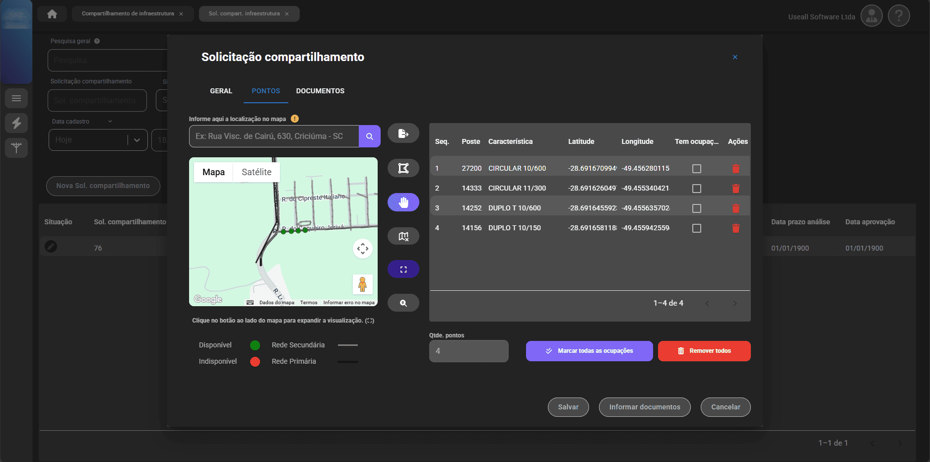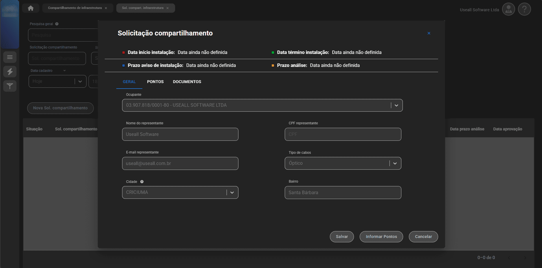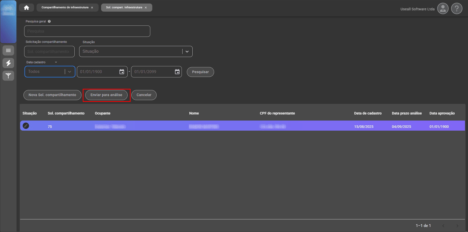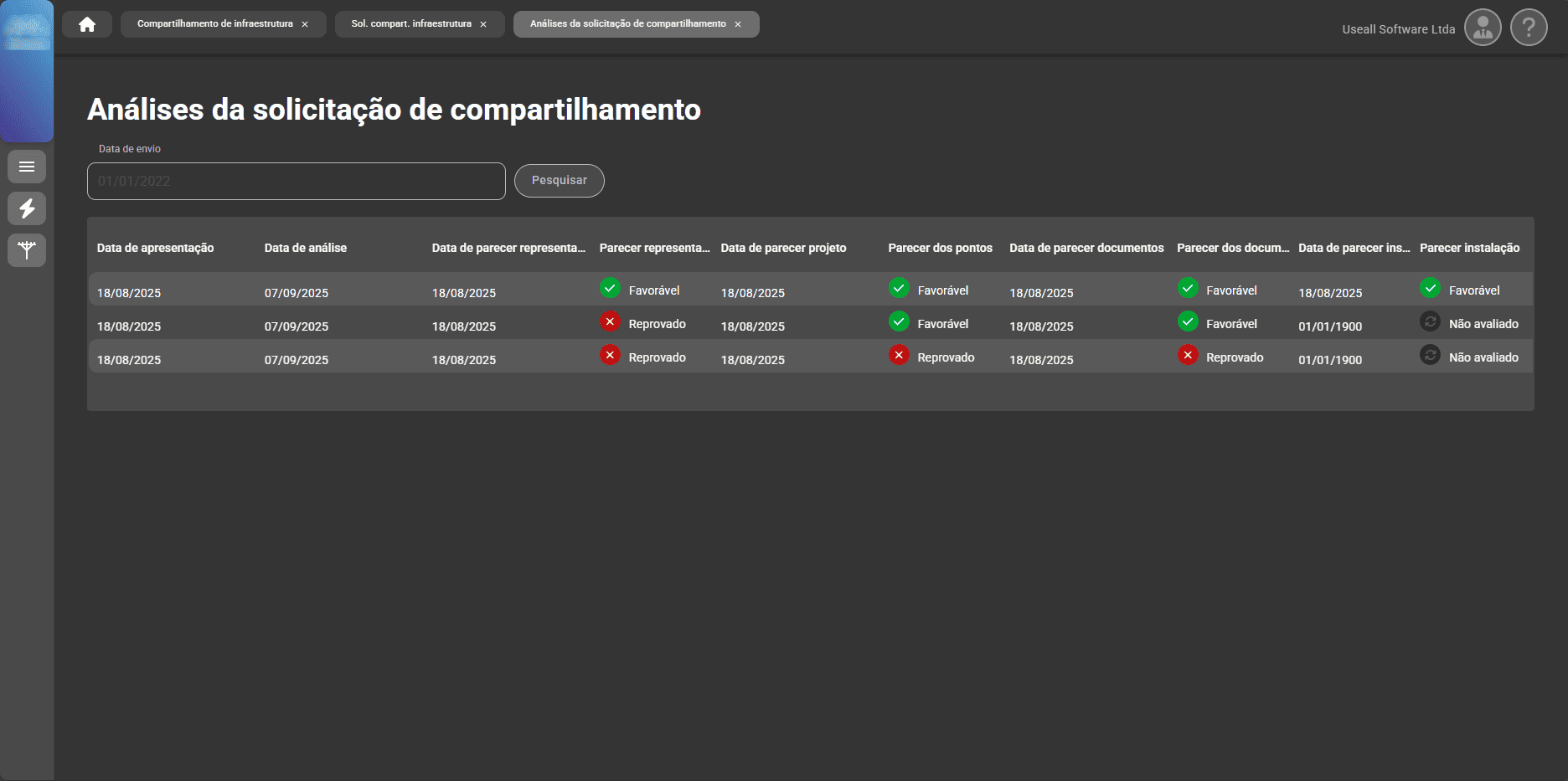 A solicitação de compartilhamento de infraestrutura é o processo que tem como objetivo gerenciar o cadastro e envio dos projetos de compartilhamento de infraestrutura para análise da distribuidora de energia elétrica, possibilitando também o acompanhamento dos mesmos.