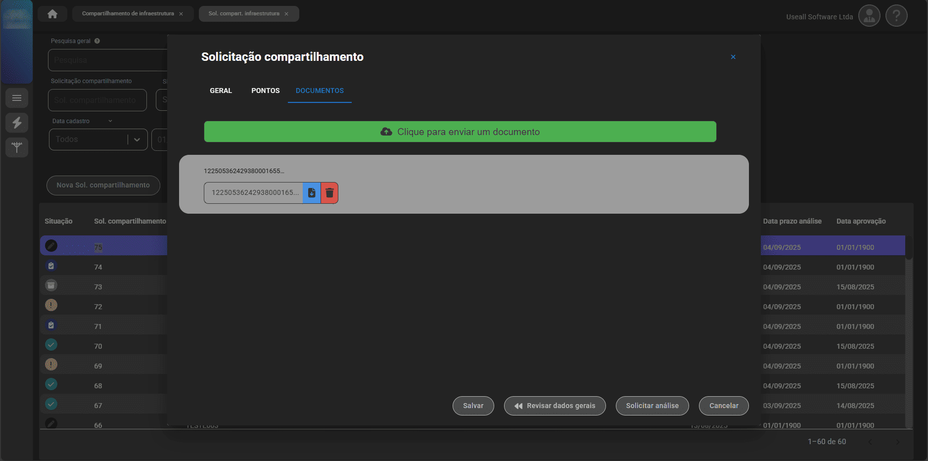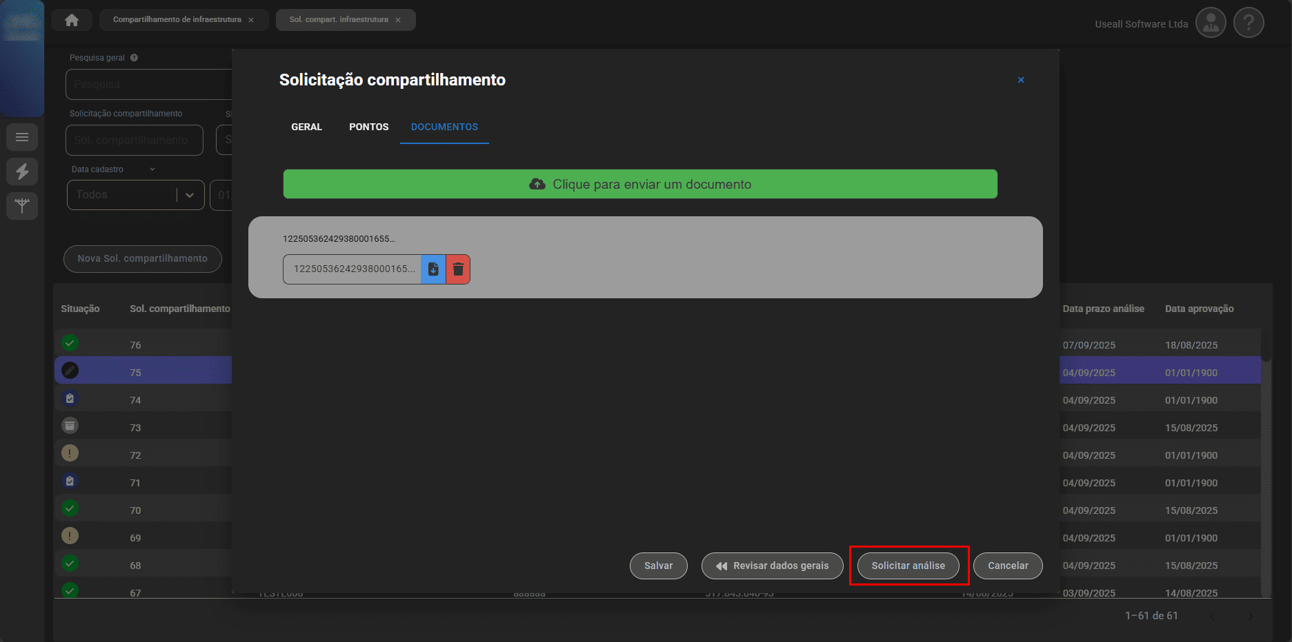 O envio do projeto para análise da distribuidora pode ser feito por meio do botão Enviar para análise, disponível na tela inicial das solicitações de compartilhamento, ou pelo botão Solicitar análise, localizado na guia Documentos do cadastro da solicitação.