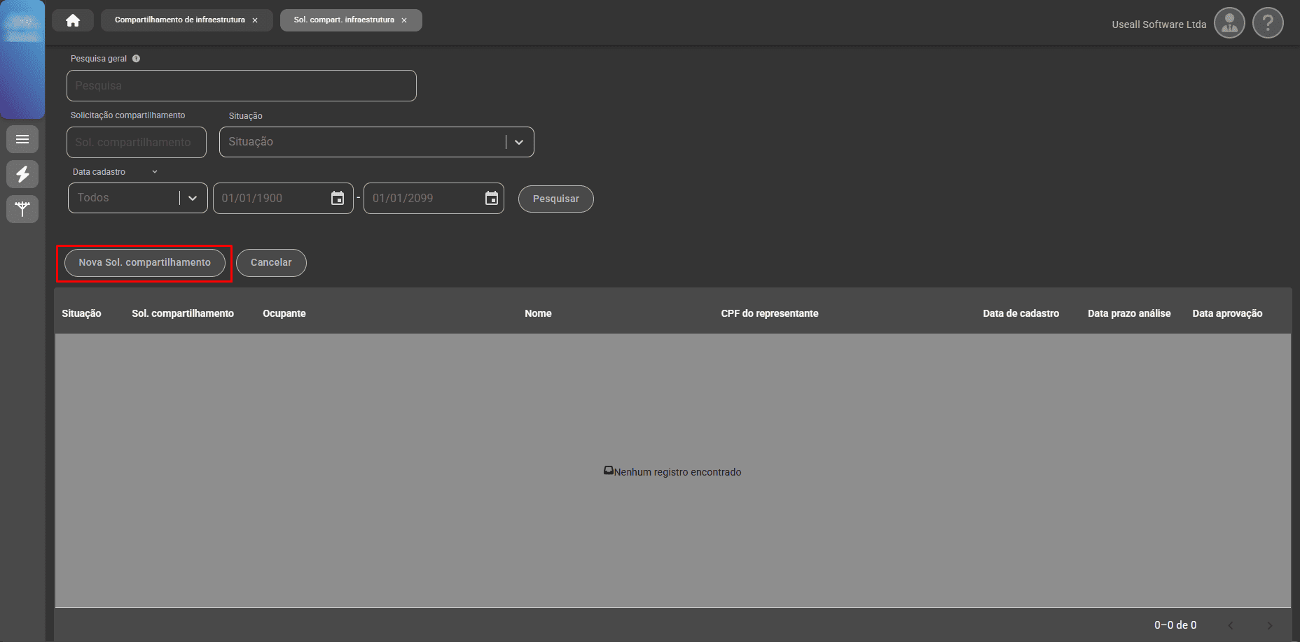 O processo de cadastro de um novo projeto inicia-se pelo botão Nova Sol. compartilhamento.