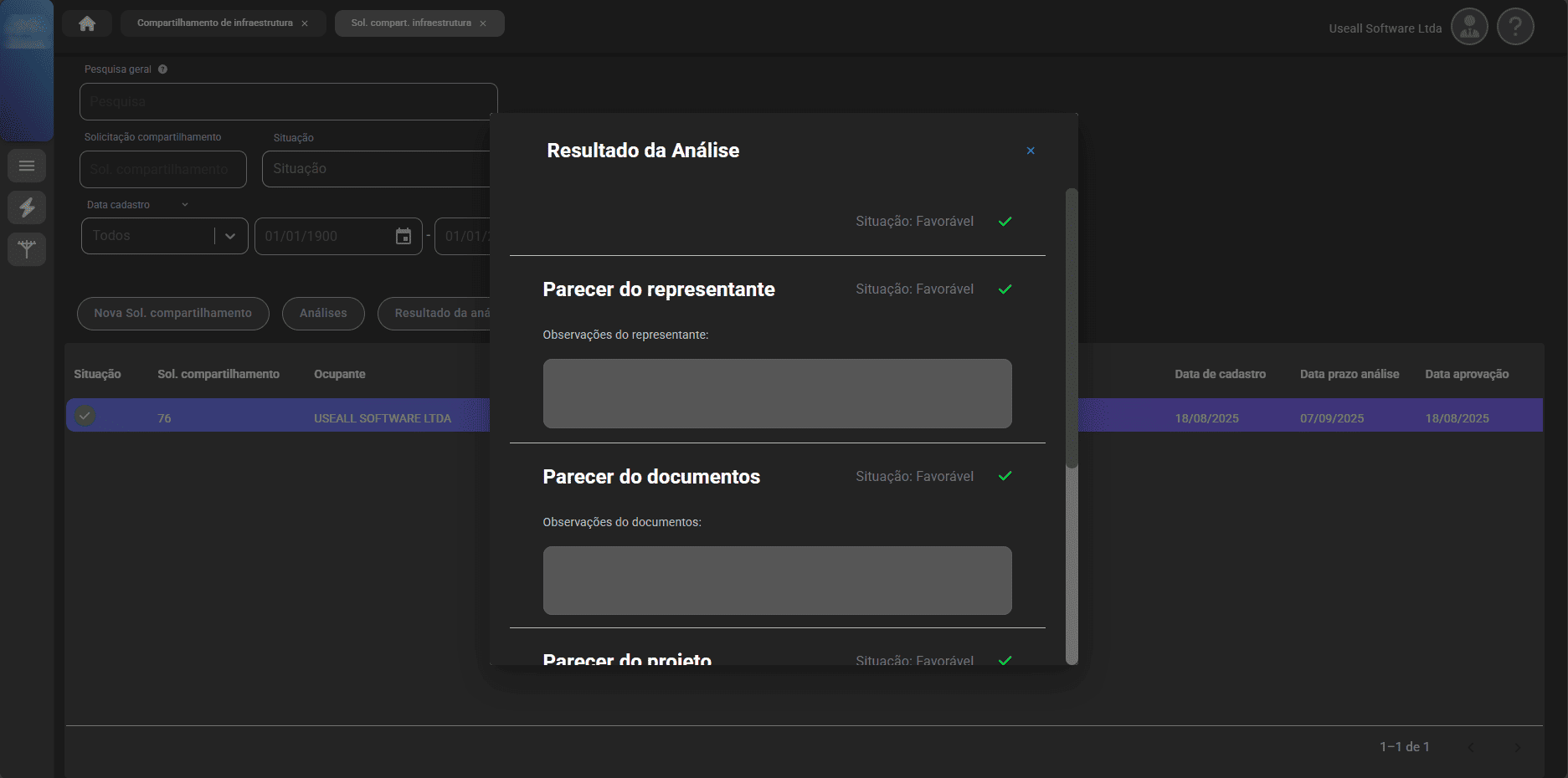 Após o envio do projeto para análise, o acompanhamento e consulta do resultado podem ser feitos pelos botões Resultado análise e Análises, disponíveis na tela inicial das solicitações de compartilhamento de infraestrutura.