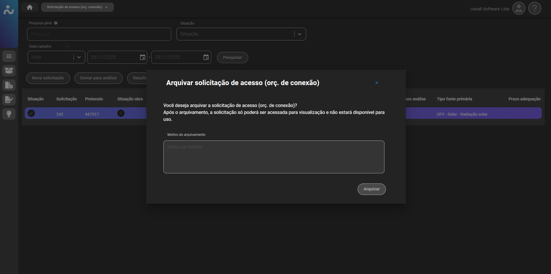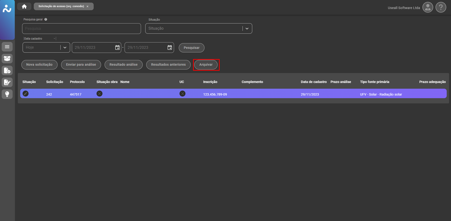 Para situações onde é iniciado o cadastro, mas não há mais necessidade de enviar para análise, ou seja, o registro ficou com status de "Em digitação", tem-se a possibilidade de arquivá-lo, através do botão "Arquivar".