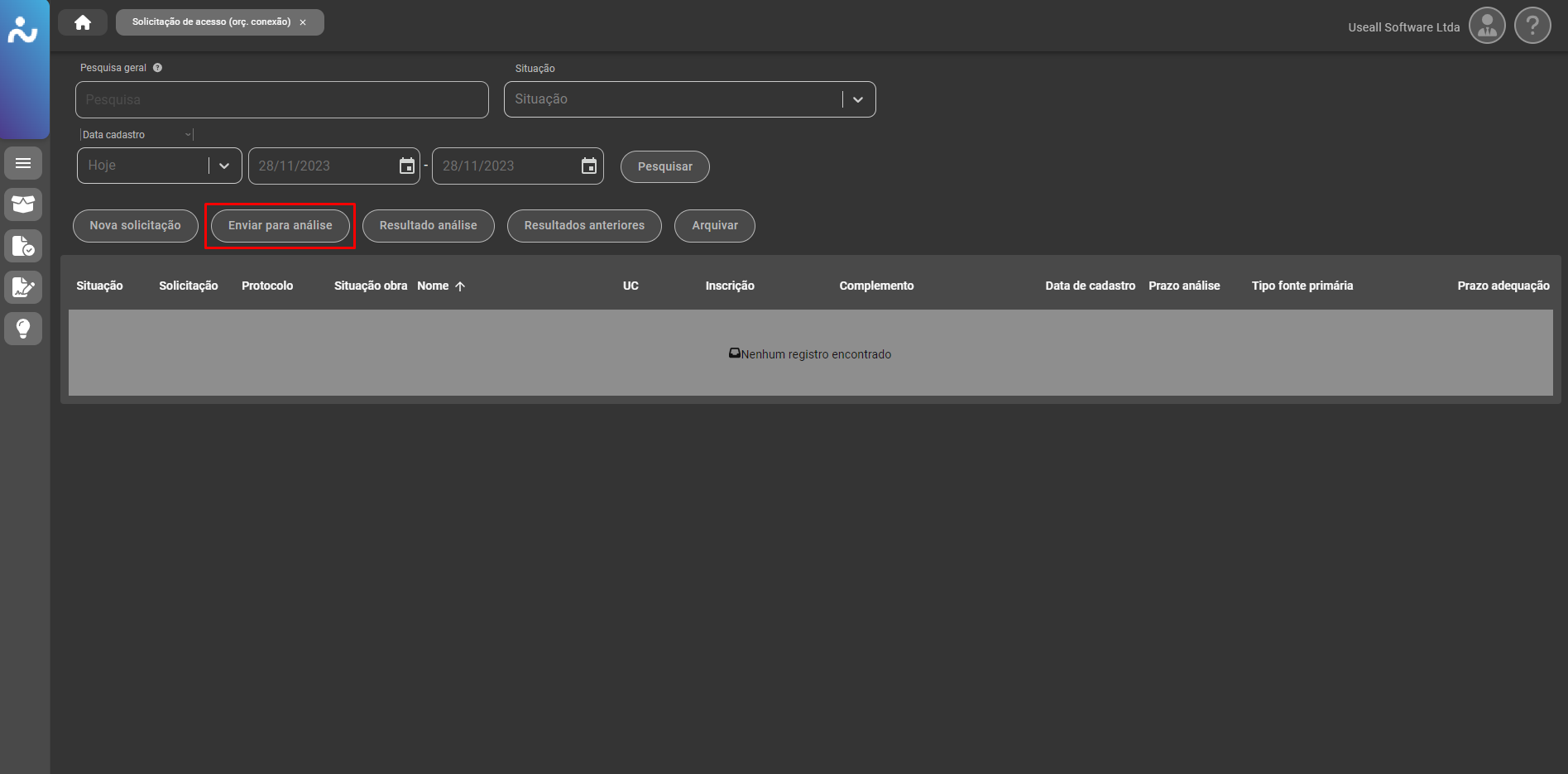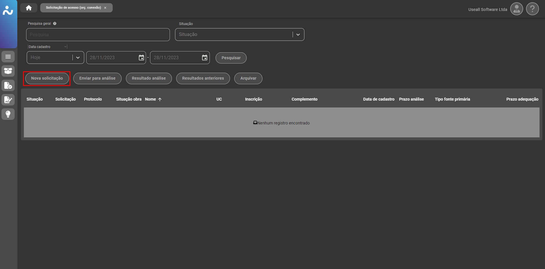 Para iniciar o cadastro de um orçamento de conexão, deve-se clicar no botão "Nova solicitação".