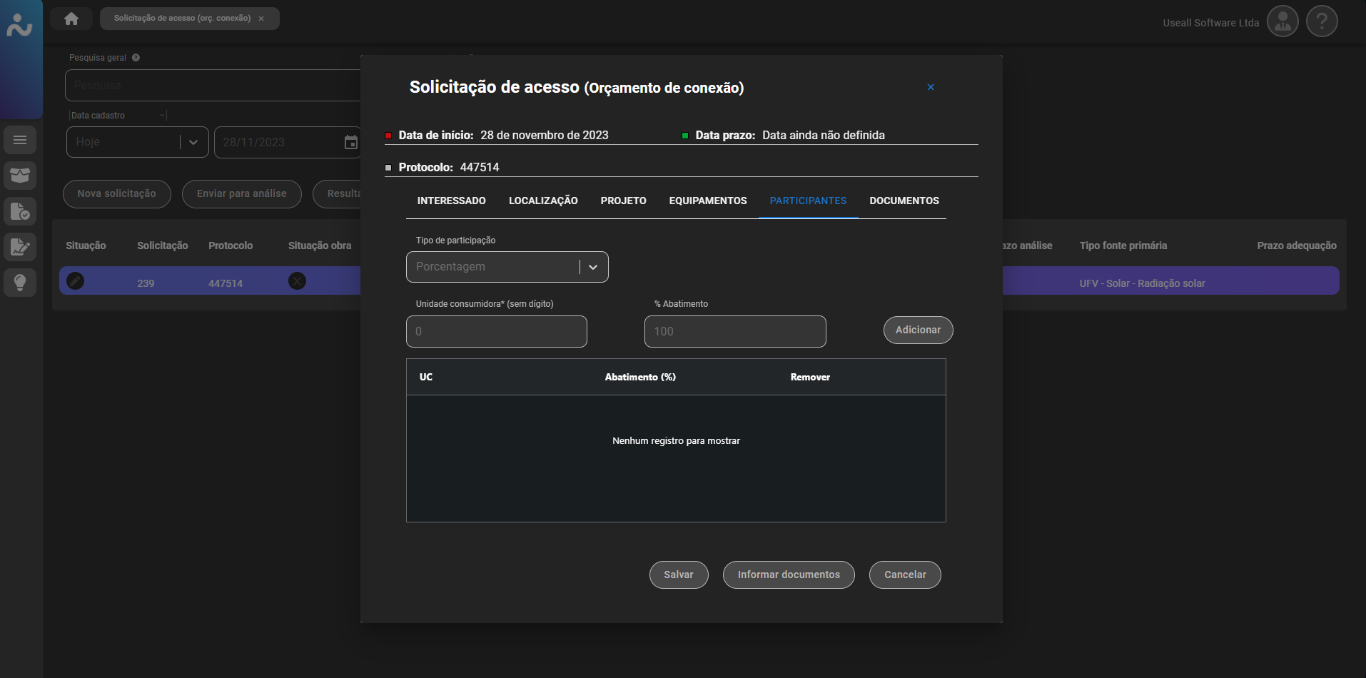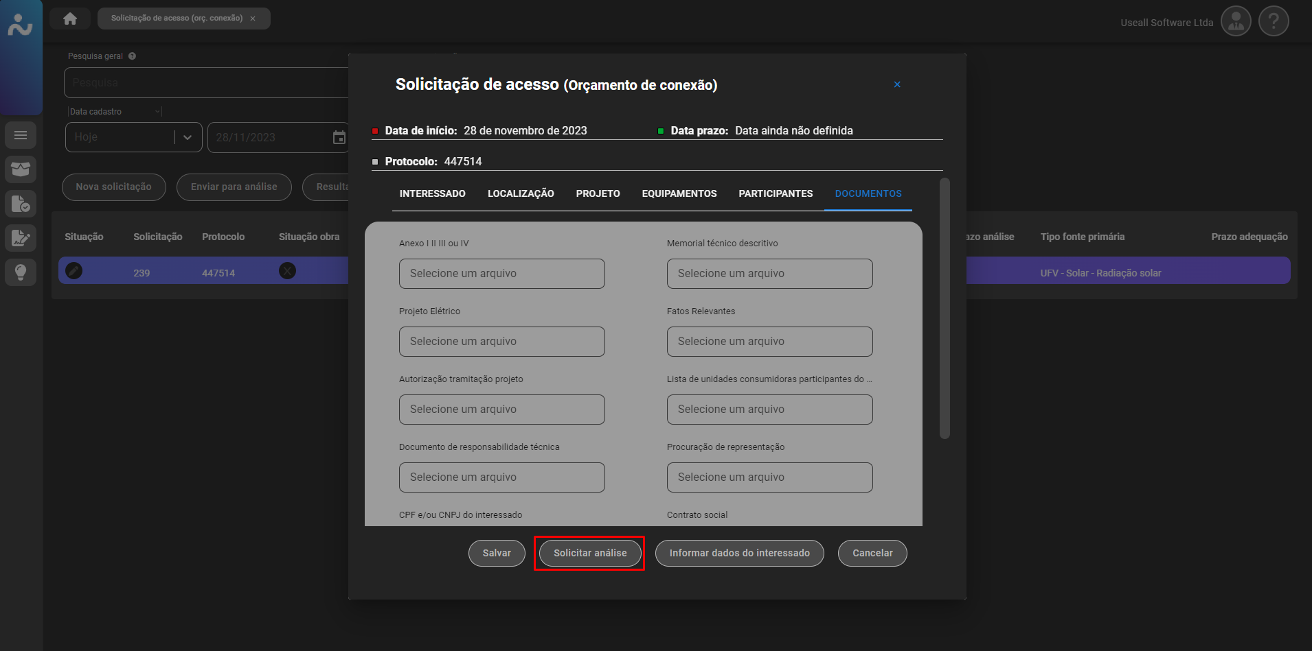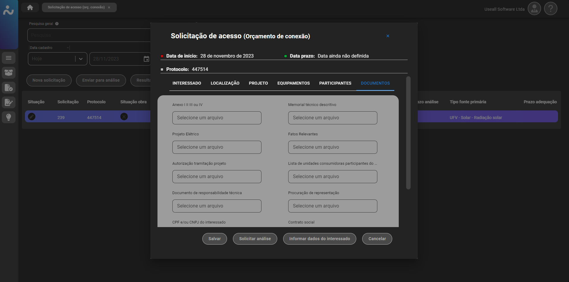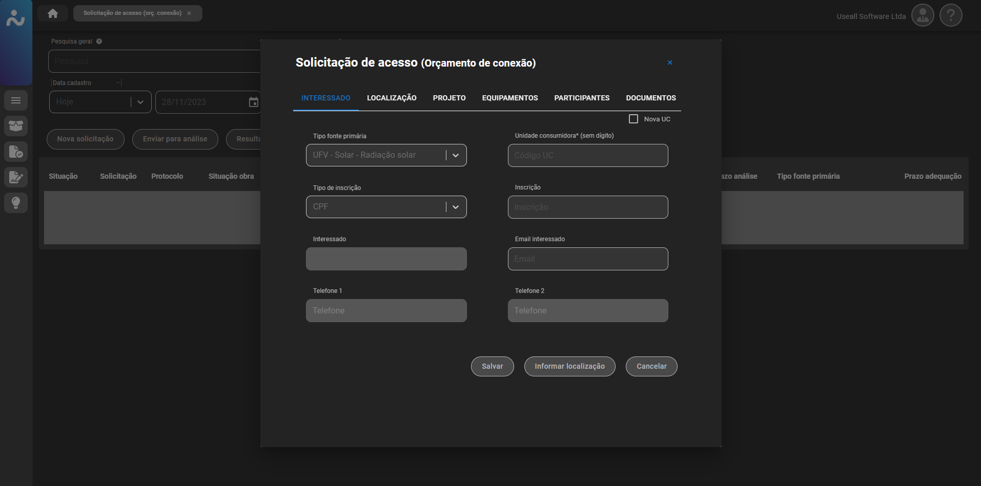 Para projetos que ainda não possuem ligação (UC), deve ser marcada a box "Nova UC", existente no canto superior direito do cadastro do orçamento. Além disso, vale ressaltar que os documentos exigidos podem variar de acordo com a configuração definida pela empresa (distribuidora).