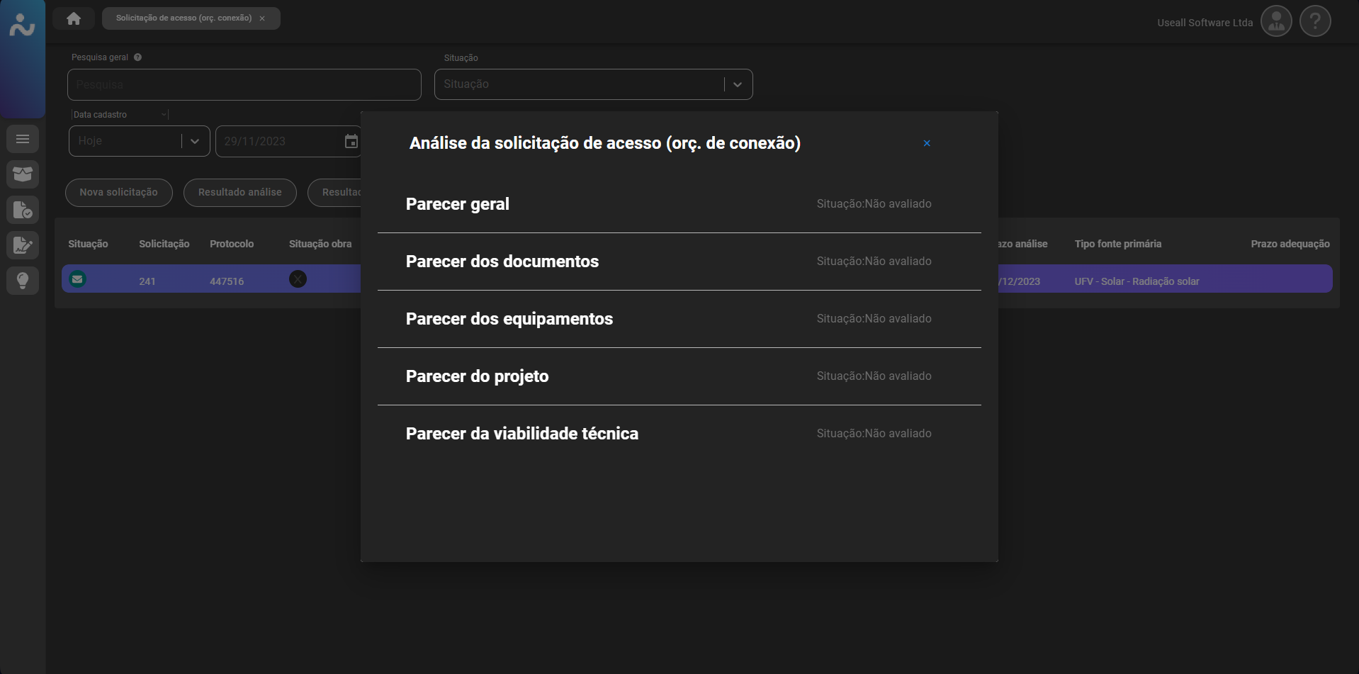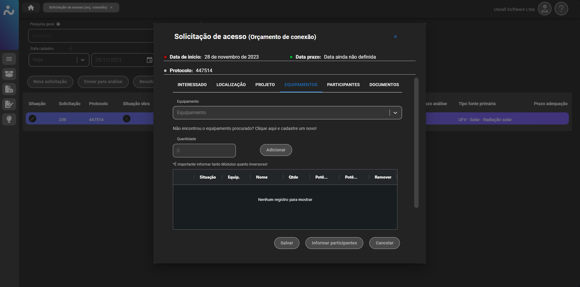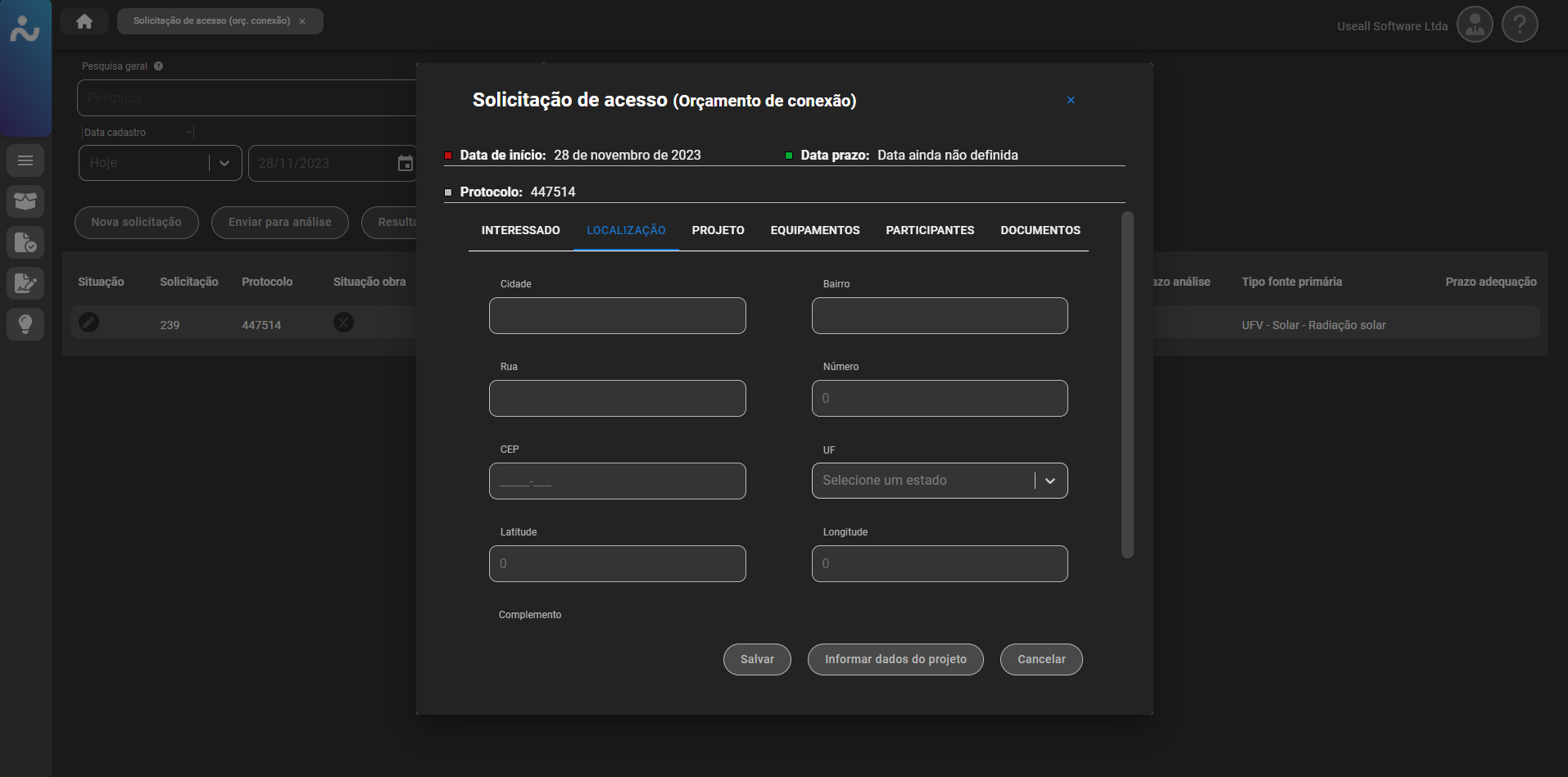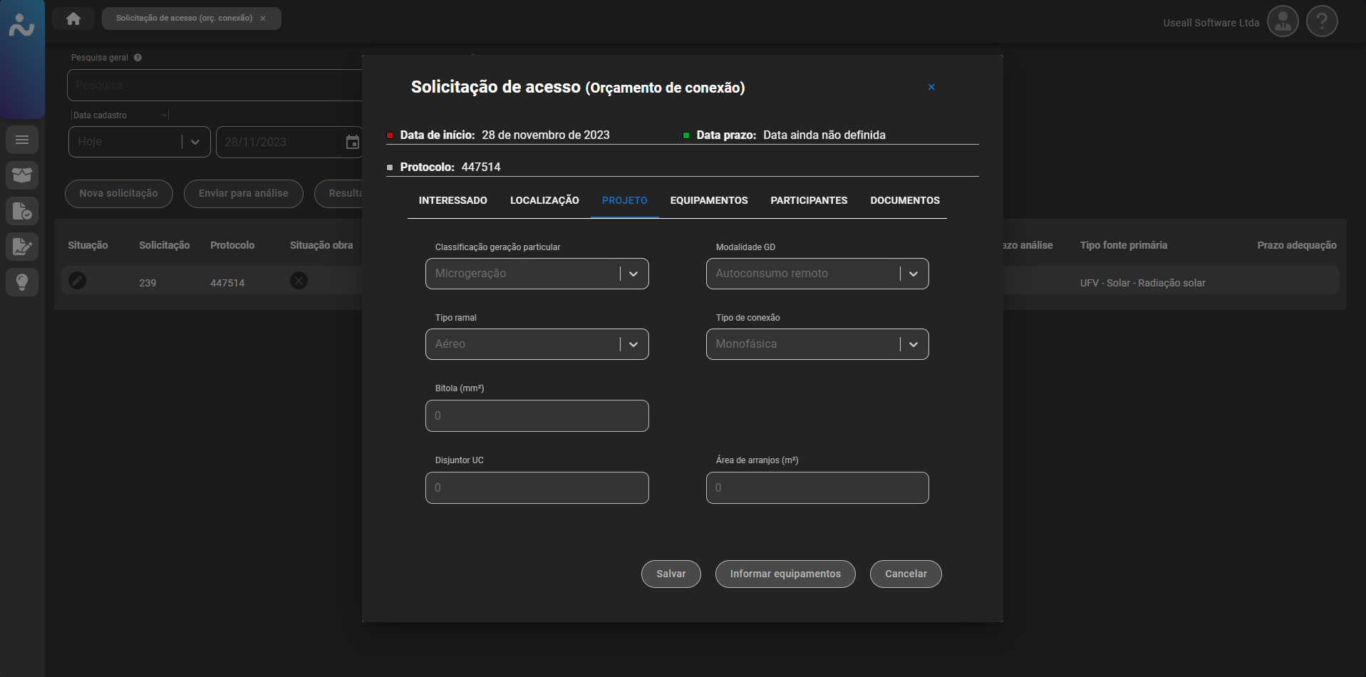 Para projetos que ainda não possuem ligação (UC), deve ser marcada a box "Nova UC", existente no canto superior direito do cadastro do orçamento. Além disso, vale ressaltar que os documentos exigidos podem variar de acordo com a configuração definida pela empresa (distribuidora).