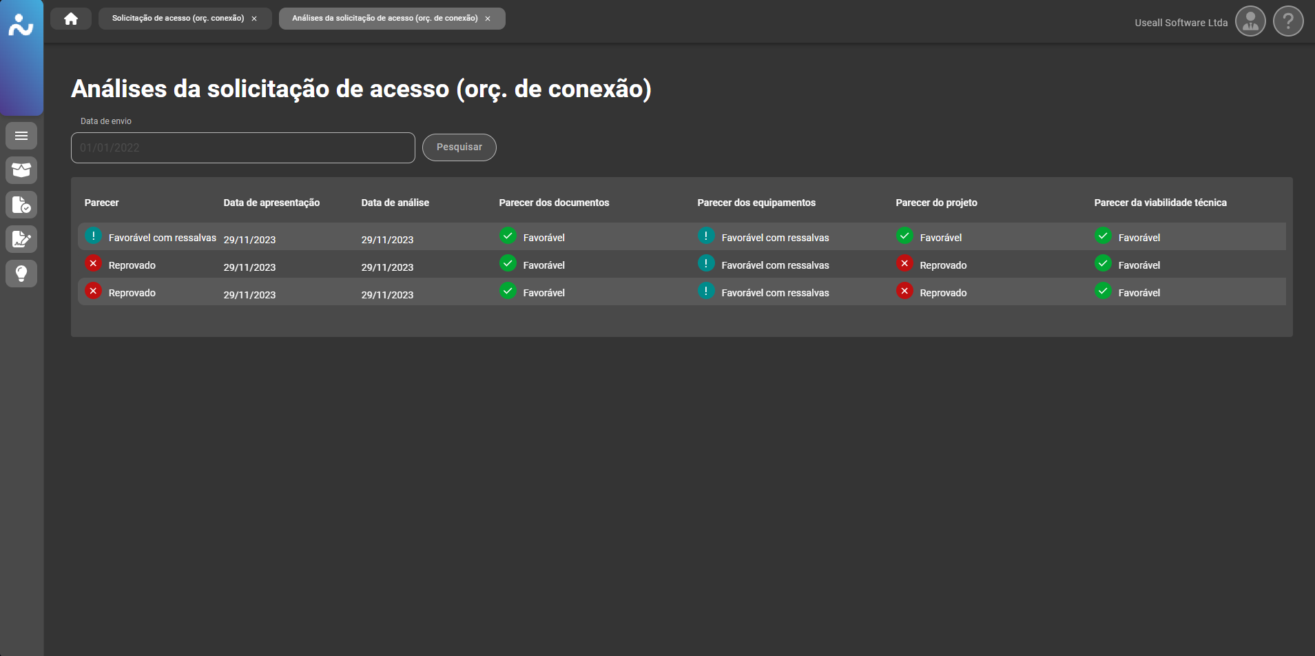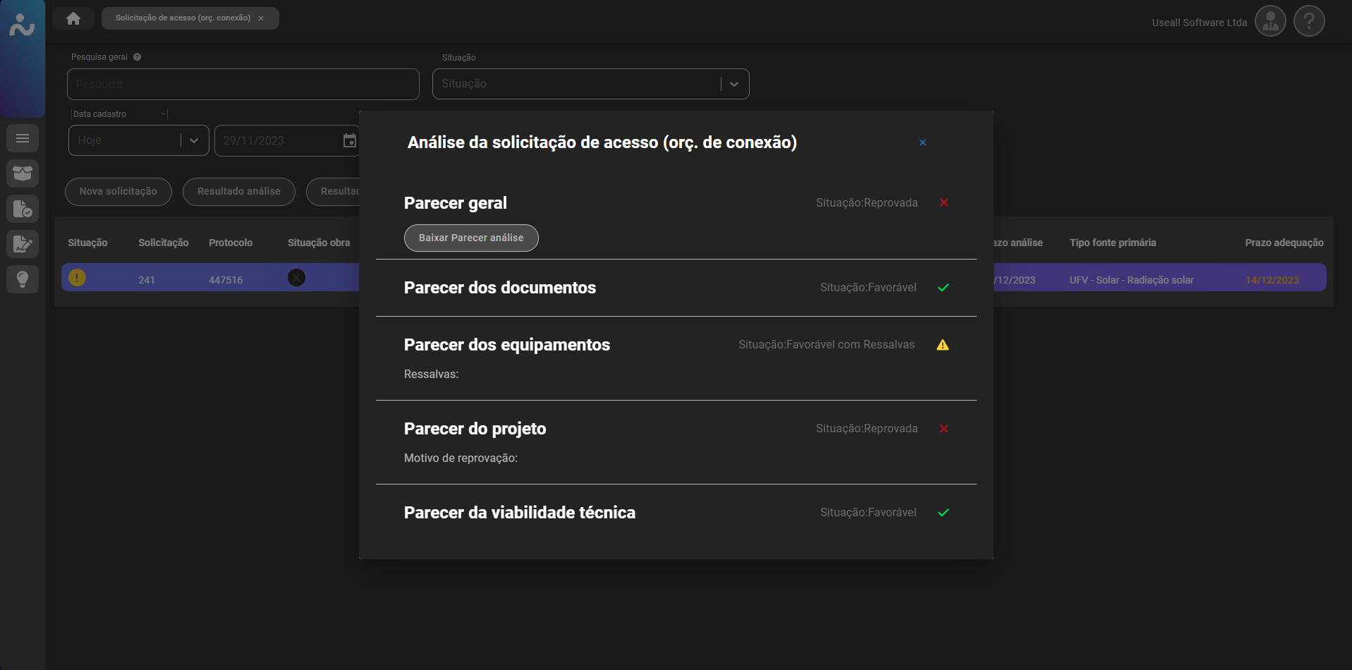 Caso o orçamento de conexão seja reprovado, o registro ficará disponível para adequação, conforme os motivos indicados na reprova. Após adequação, pode ser reenviado para análise.