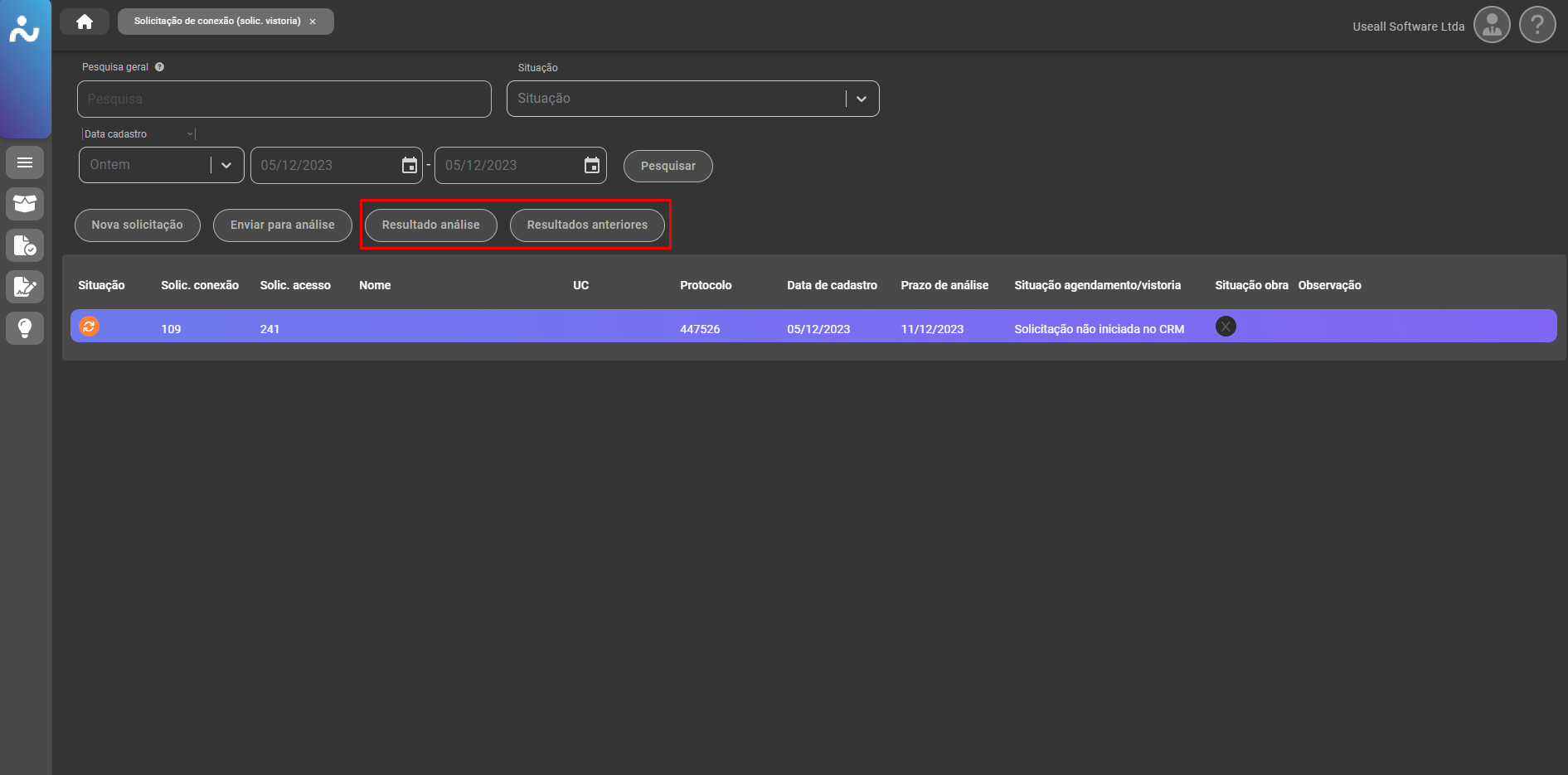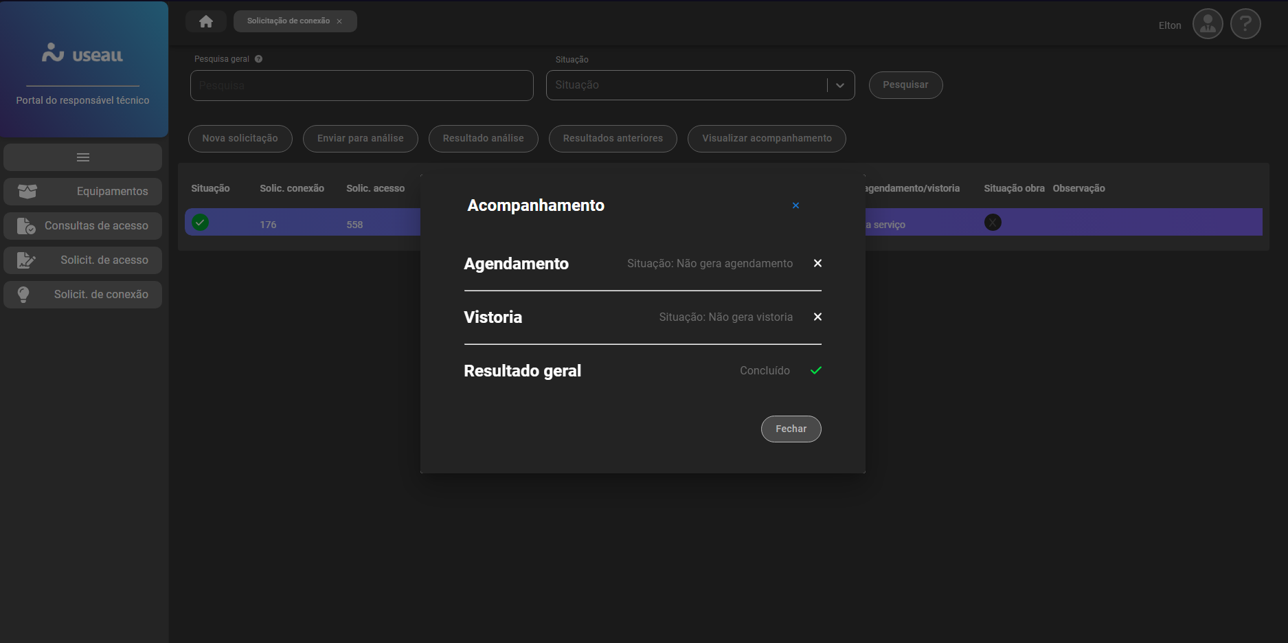 - Resultado análise: neste local, será exibido o parecer definido pela distribuidora sobre a análise do pedido de vistoria;
