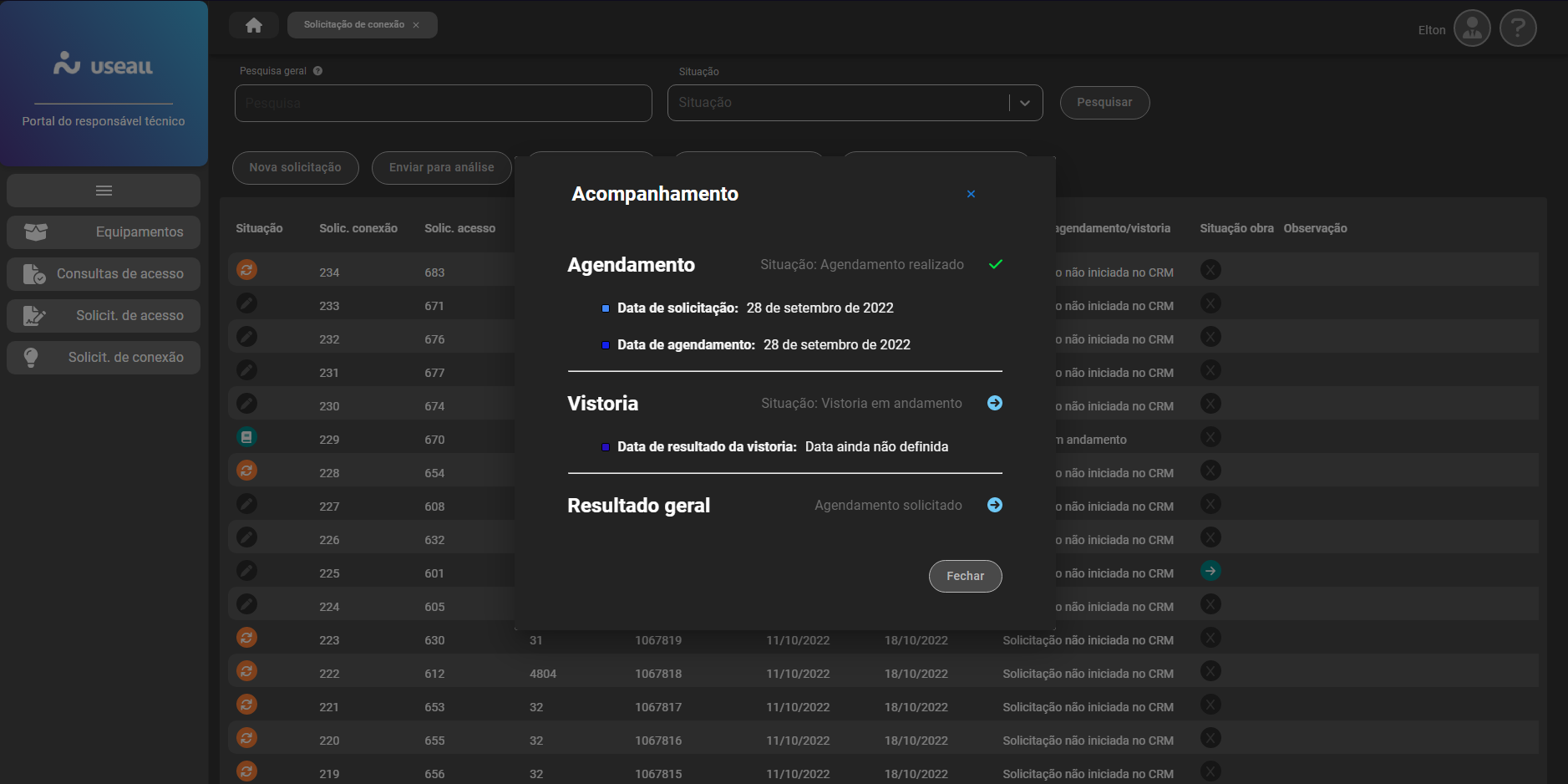 Essa etapa está vinculada à etapa anterior de orçamento de conexão e depende dela para ocorrer. Ou seja, é necessário que o orçamento de conexão seja aprovado antes de solicitar a vistoria.