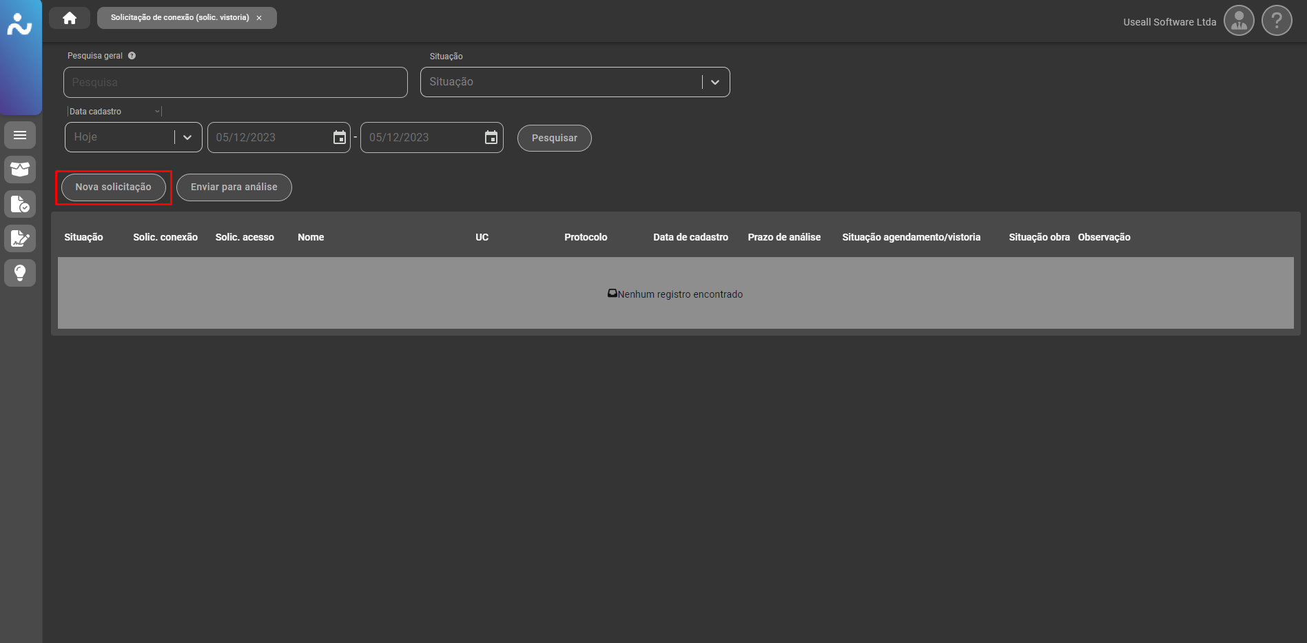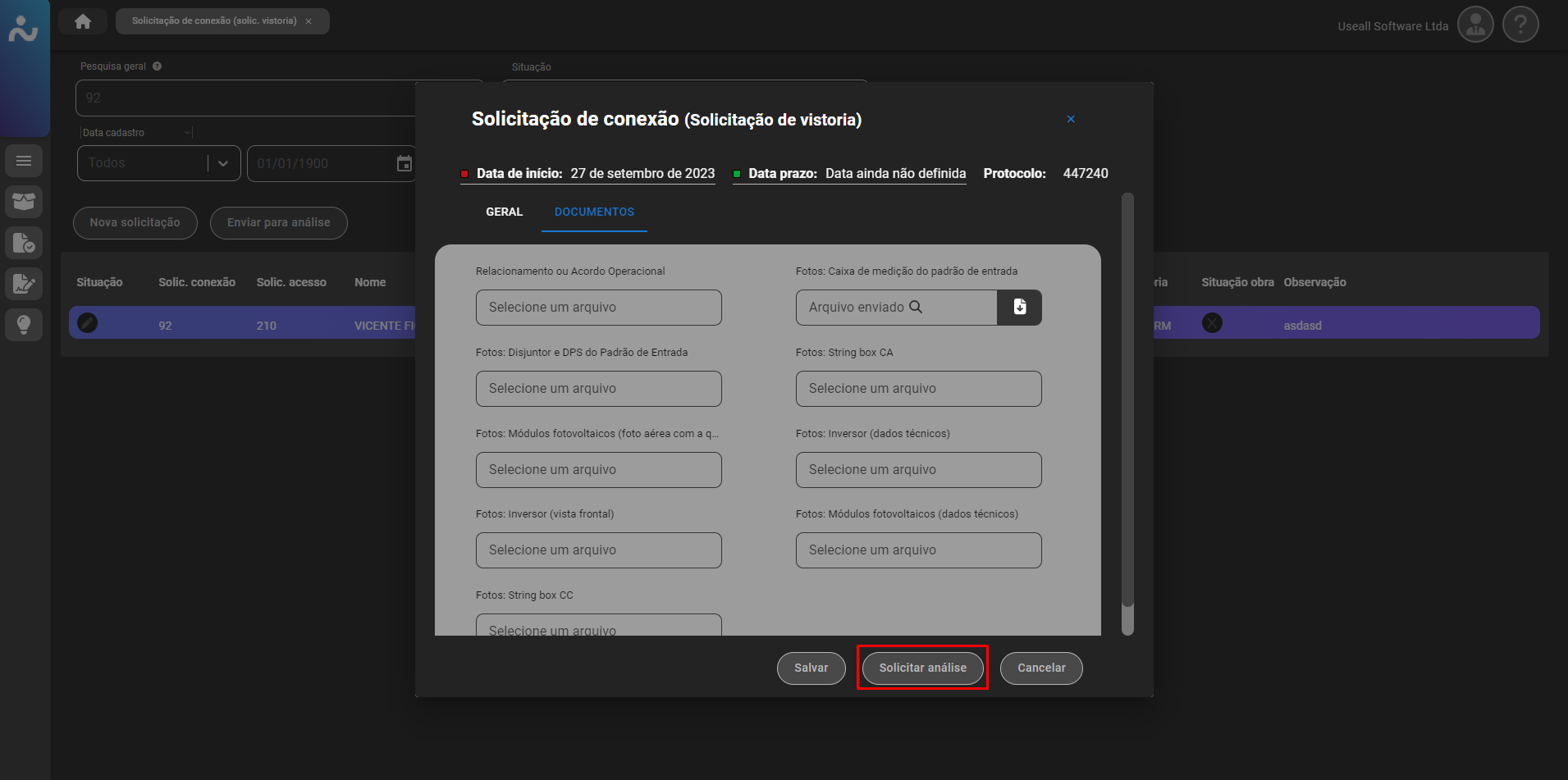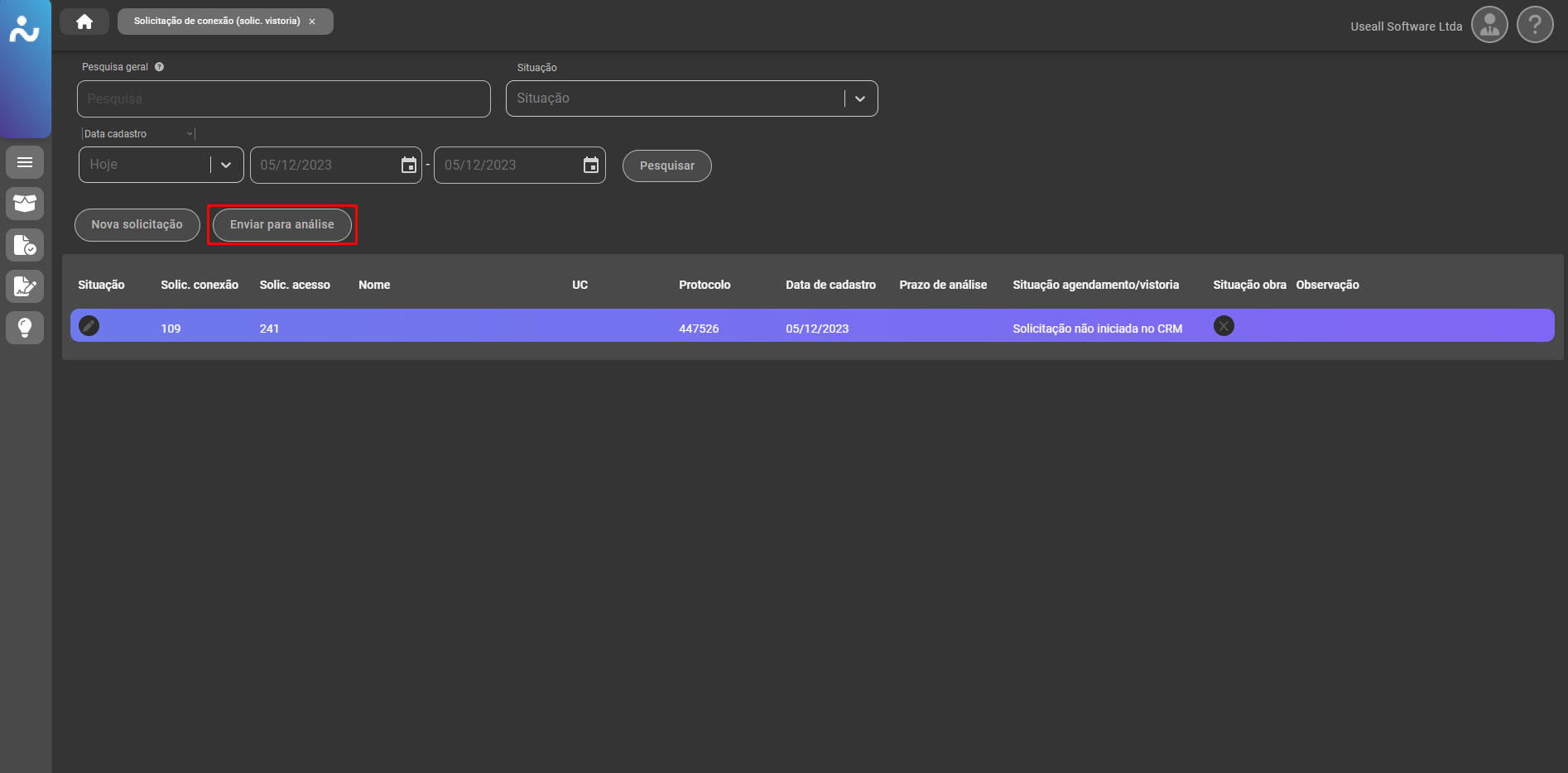 Feito o preenchimento dos dados, pode-se enviar o registro para análise e possível aprovação. Tal ação pode ser executada através do botão "Enviar para análise", existente na tela de início das solicitações de conexões e/ou pelo botão "Solicitar análise", existente na tela de cadastro da solicitação de vistoria.